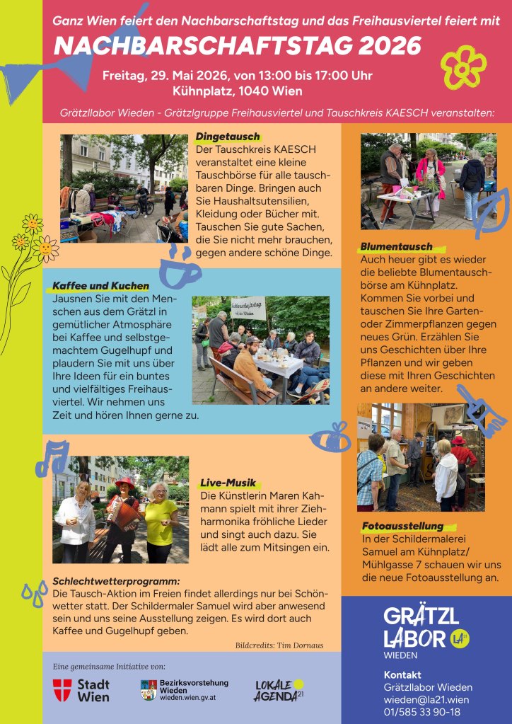 Gemeinsam mit der Grätzlgruppe Freihausviertel veranstalten wir auch heuer wieder einen Nachbarschaftstag, und zwar am Freitag, 29. Mai 2026, von 13:00 bis 17:00 Uhr, am Kühnplatz, 1040 Wien. Herzliche Einladung!!!